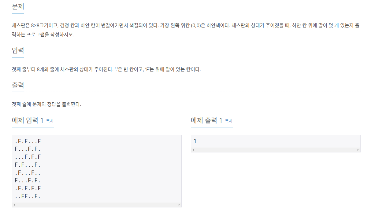 체스판은 8×8크기이고, 검정 칸과 하얀 칸이 번갈아가면서 색칠되어 있다. 가장 왼쪽 위칸 (0,0)은 하얀색이다. 체스판의 상태가 주어졌을 때, 하얀 칸 위에 말이 몇 개 있는지 출력하는 프로그램