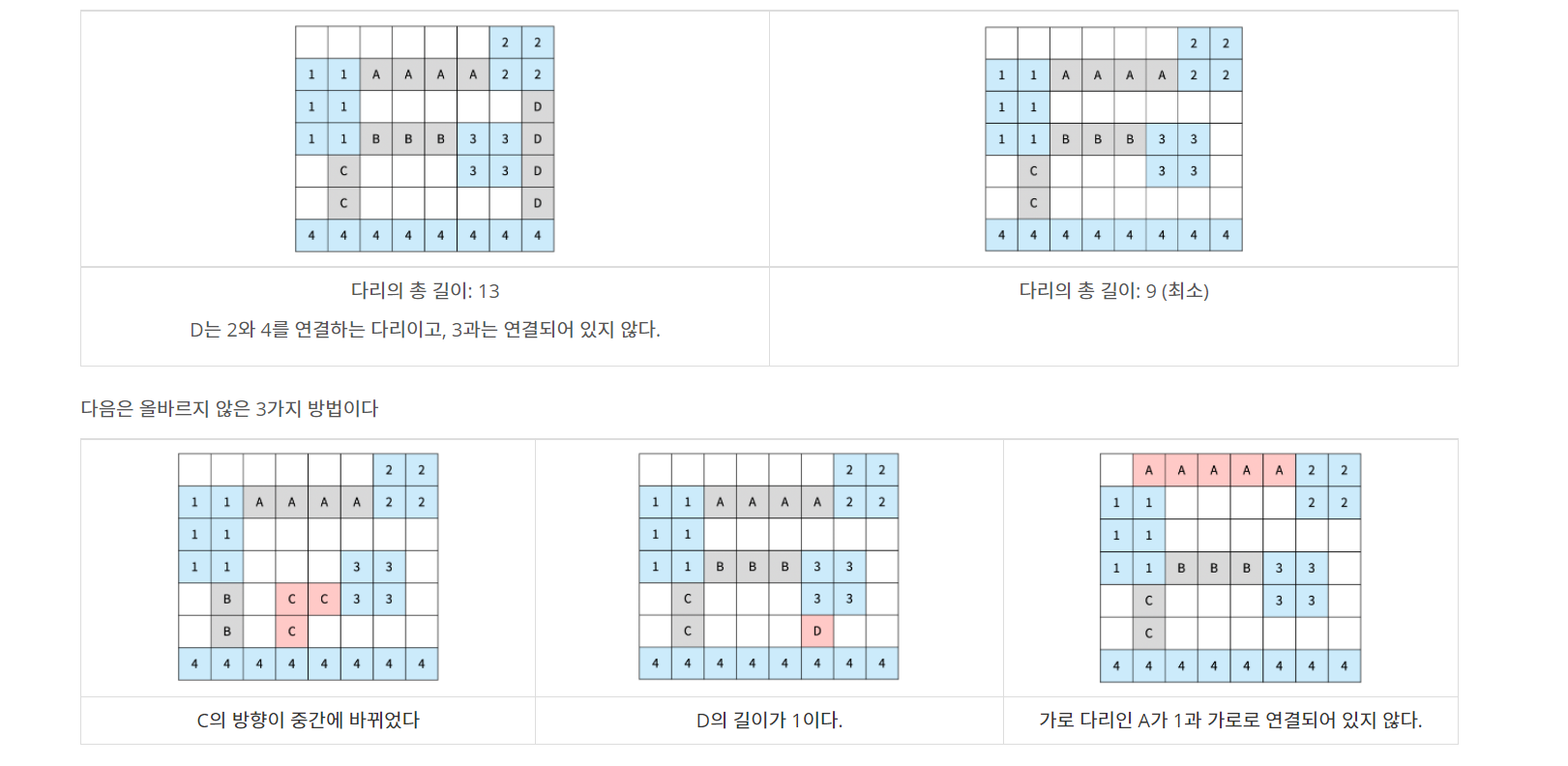 위와 같은 조건으로 다리를 연결해 건널 수 있는 최소 연결 갯수를 구하는 문제입니다.