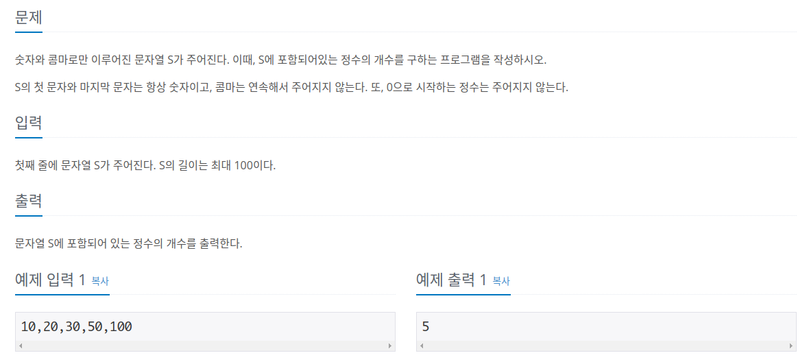 숫자와 콤마로만 이루어진 문자열 S가 주어진다. 이때, S에 포함되어있는 정수의 개수를 구하는 프로그램을 작성하시오. S의 첫 문자와 마지막 문자는 항상 숫자이고, 콤마는 연속해서 주어지지