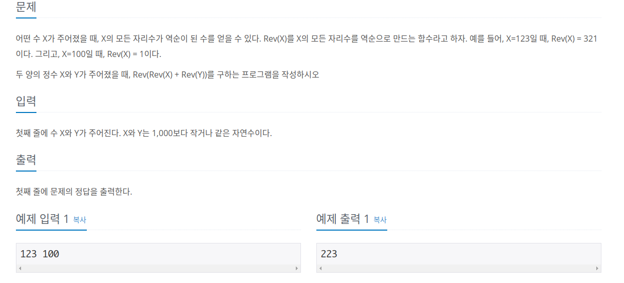 어떤 수 X가 주어졌을 때, X의 모든 자리수가 역순이 된 수를 얻을 수 있다. Rev(X)를 X의 모든 자리수를 역순으로 만드는 함수라고 하자. 예를 들어, X=123일 때, Rev(X) = 321이다. 그리고, X=100일 때, Rev(