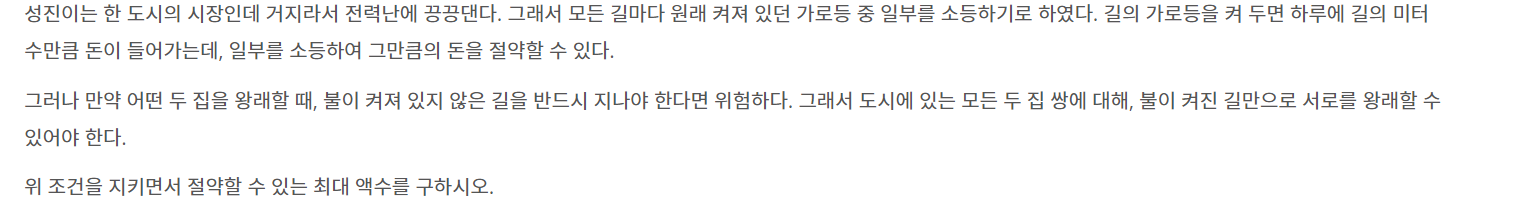 성진이는 한 도시의 시장인데 거지라서 전력난에 끙끙댄다. 그래서 모든 길마다 원래 켜져 있던 가로등 중 일부를 소등하기로 하였다. 길의 가로등을 켜 두면 하루에 길의 미터 수만큼 돈이 들