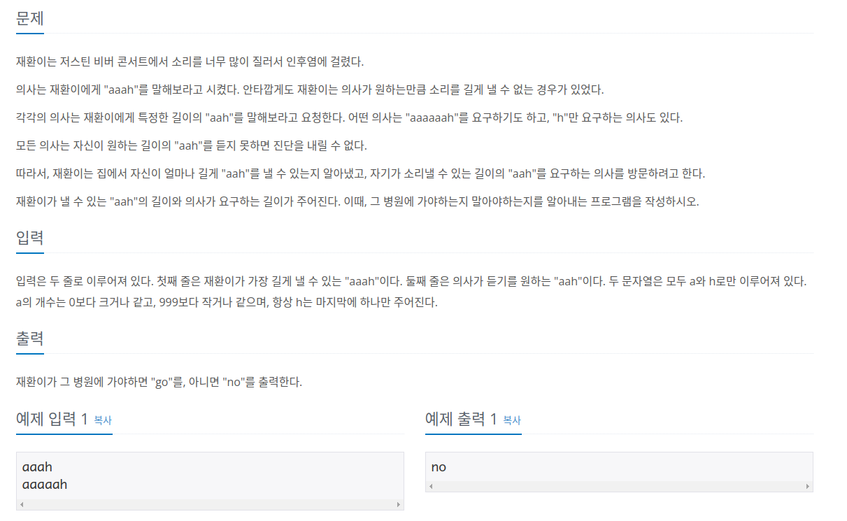 입력은 두 줄로 이루어져 있다. 첫째 줄은 재환이가 가장 길게 낼 수 있는 "aaah"이다. 둘째 줄은 의사가 듣기를 원하는 "aah"이다. 두 문자열은 모두 a와 h로만 이루어져 있다. a의 개수는 0보다 크거