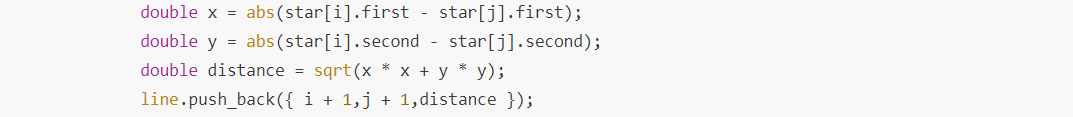 abs를 통해서 절대값을 저장한뒤에 제곱의 합을 sqrt를 해서 거리를 구했습니다. 그 뒤에 백터에 저장했습니다.