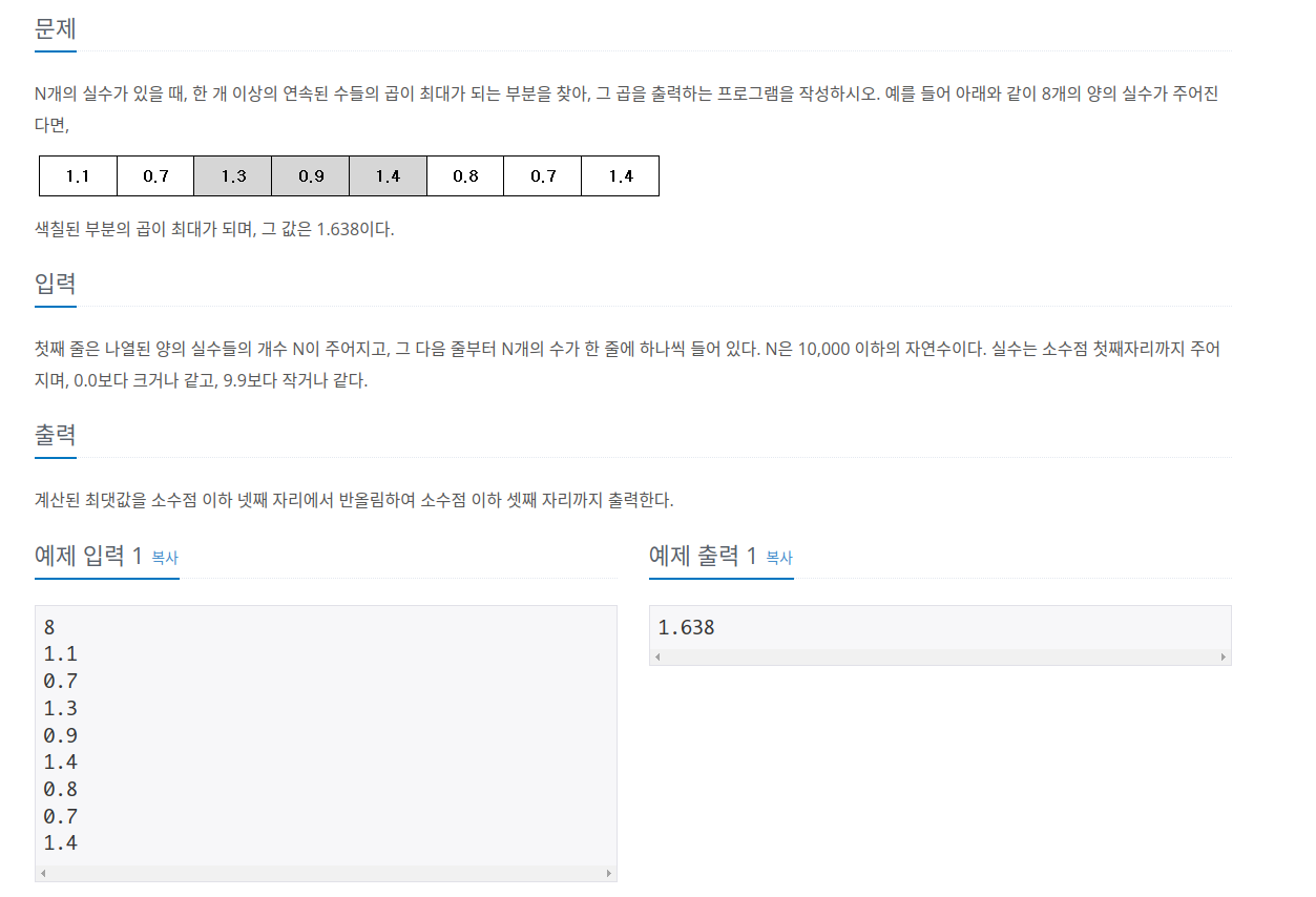 따라서 DP를 사용해서 지금까지 곱한 값의 최댓값을 저장해주면서 풀어나가면 됩니다.