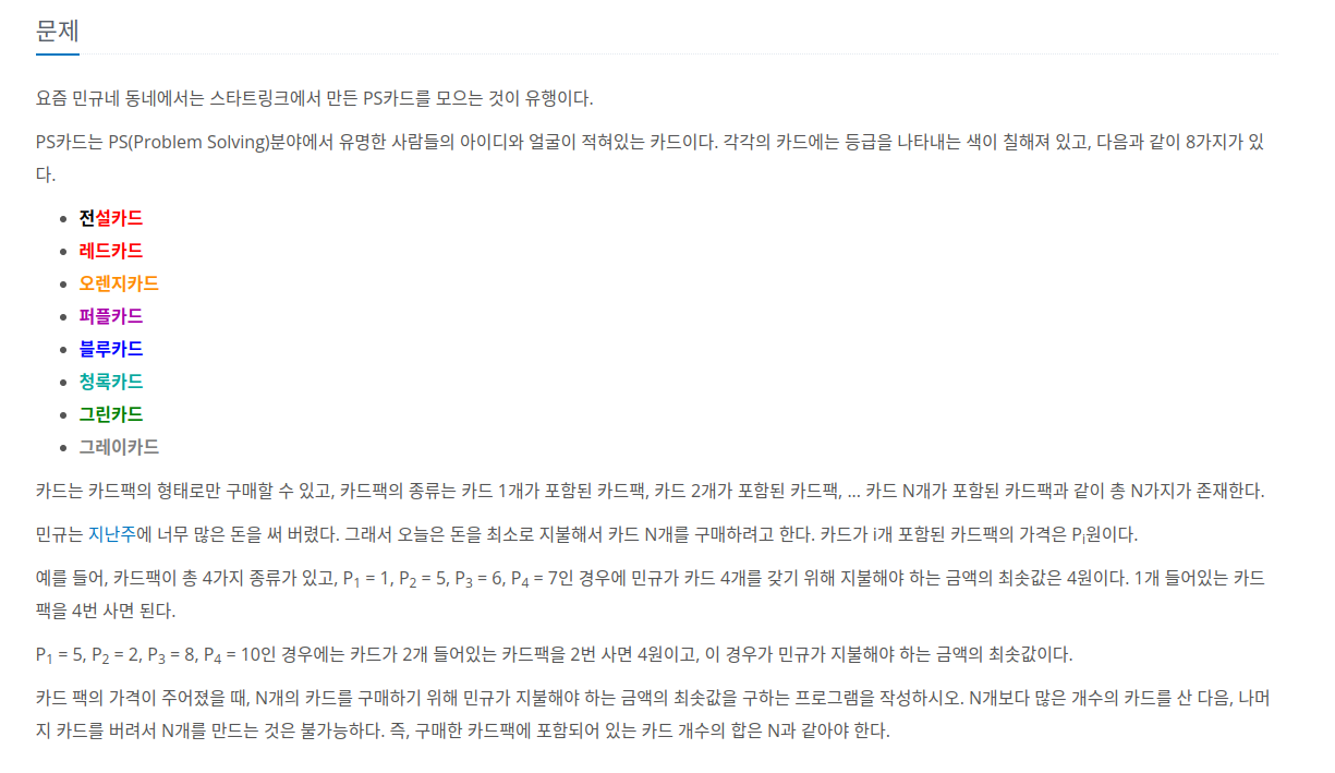 최소한의 금액으로 N개의 카드를 정확하게 살 때 드는 비용을 구하는 문제입니다.