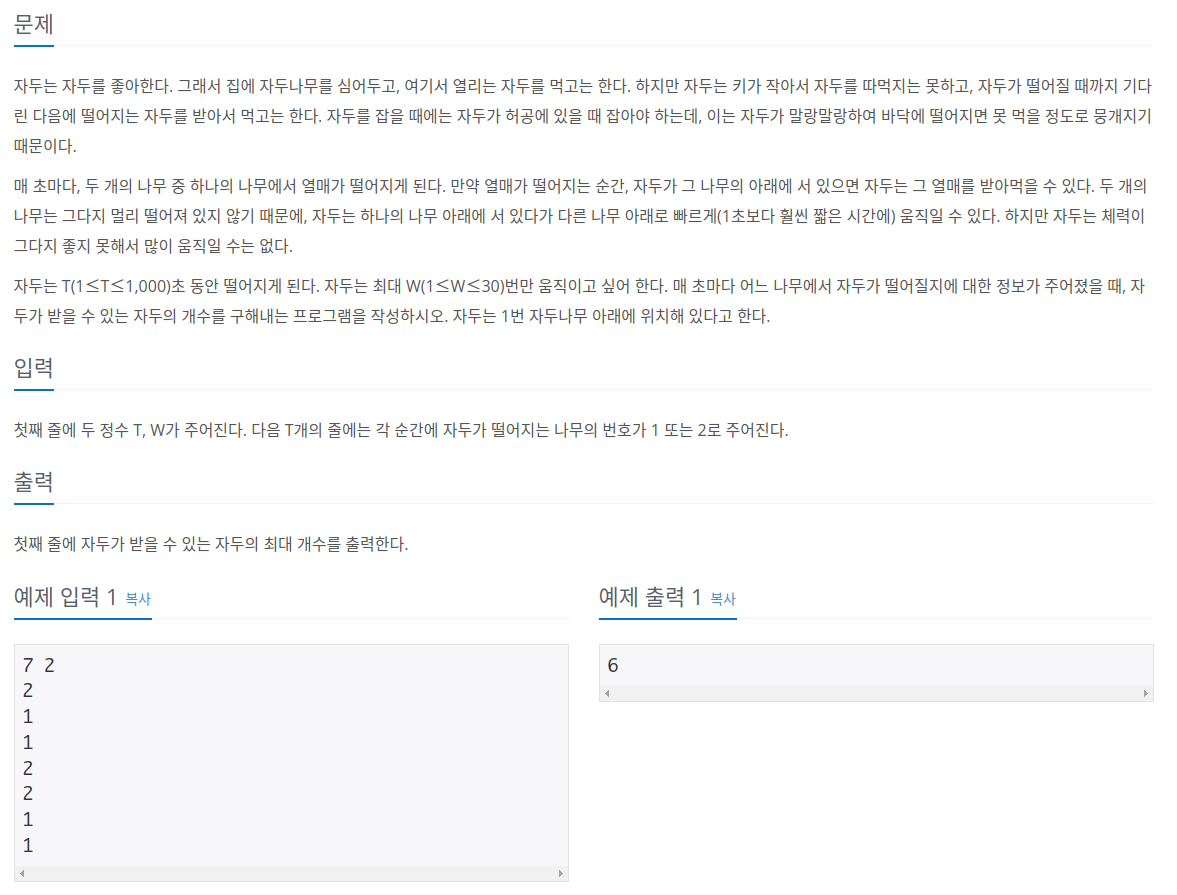이 문제를 풀기 위해서는 X초에서 0~W번 움직여서 먹을 수 있는 최대 자두의 개수를 저장하는 것이 중요합니다.