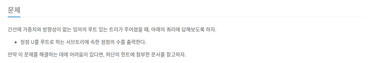 트리가 주어졌을 때, 쿼리를 기준으로 자신을 포함한 자식노드의 개수를 구하는 문제입니다.