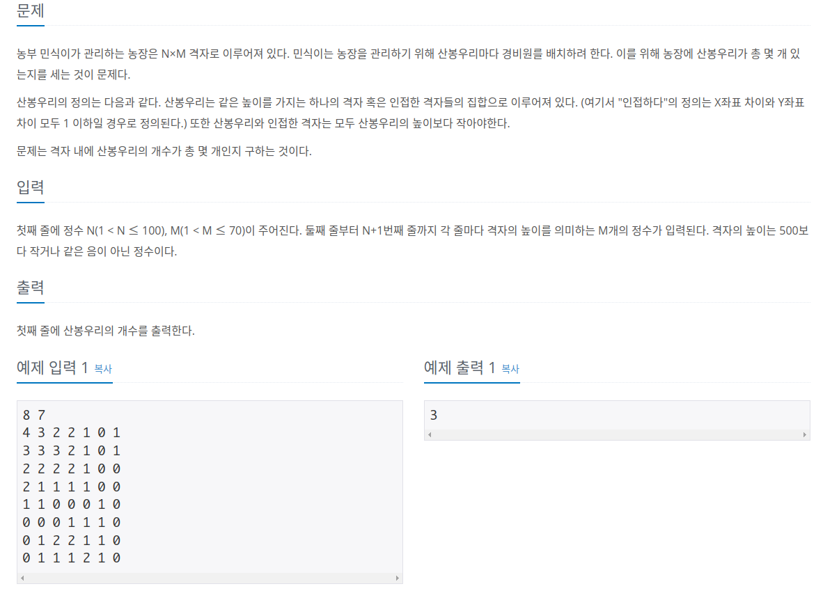 따라서, 1이상의 같은 격좌로 이루어져 있으며, 8방향으로 이어지고, 주변보다 높이가 큰 좌표라고 할 수 있습니다.
