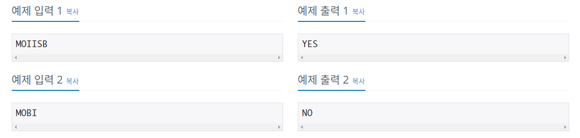 주어진 문자열에 포함된 알파벳 대문자들을 이용해 MOBIS를 만들 수 있으면 "YES", 그렇지 않으면 "NO"를 출력한다.