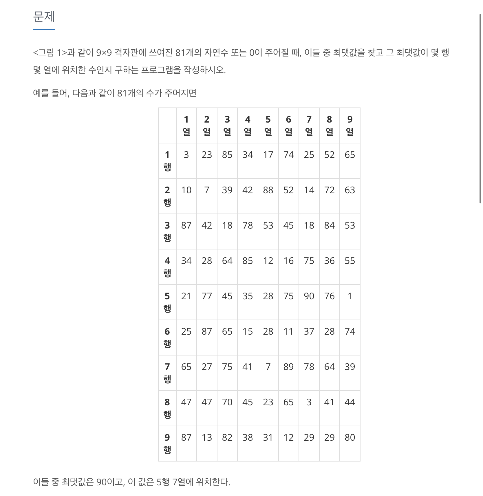 9*9 배열이 주어졌을 때, 최댓값의 크기와 행렬을 구하는 문제입니다.