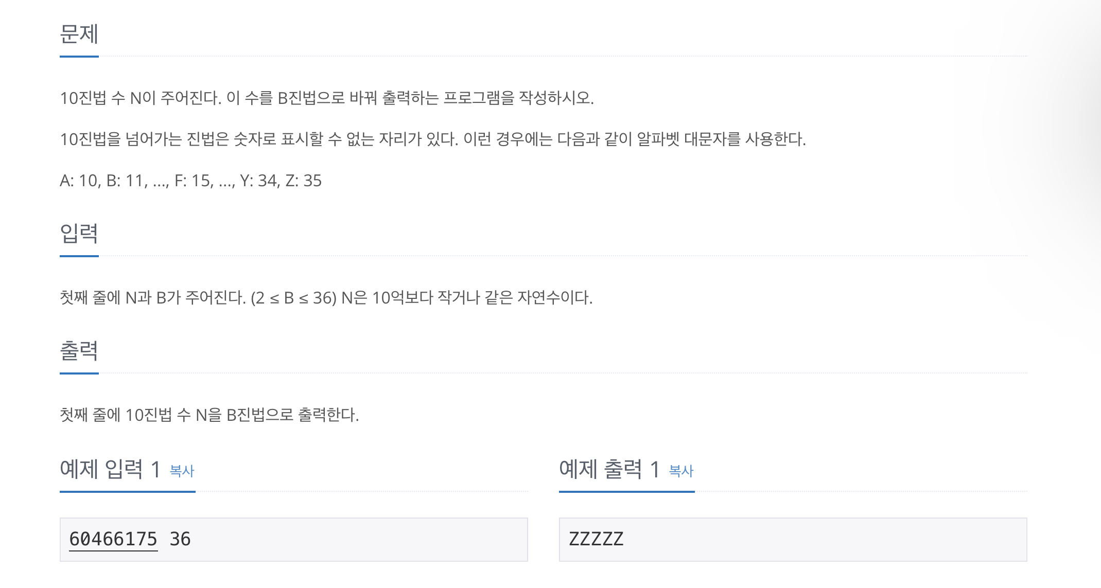 만약 나머지가 10이상이 될 경우, 알파벳을 통해 수를 나타내야됩니다.(A->10, Z->35)