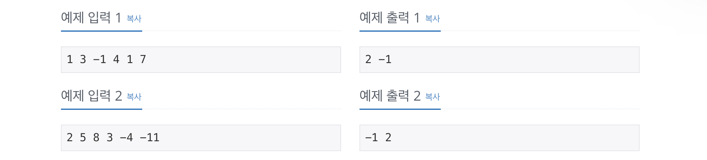 정수 $a$, $b$, $c$, $d$, $e$, $f$가 공백으로 구분되어 차례대로 주어진다. ($-999 \leq a,b,c,d,e,f \leq 999$) 문제에서 언급한 방정식을 만족하는 $\left(x,y\right)$가 유일하게 존재하고, 이 때 $x$와 $y$가 각각 $-