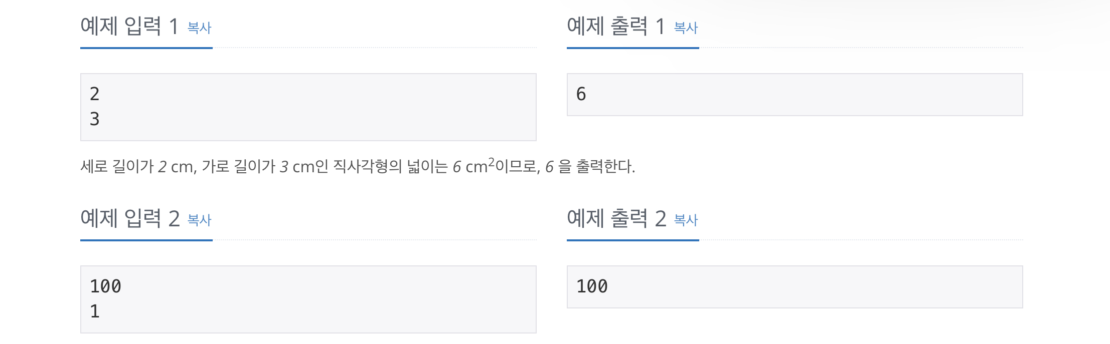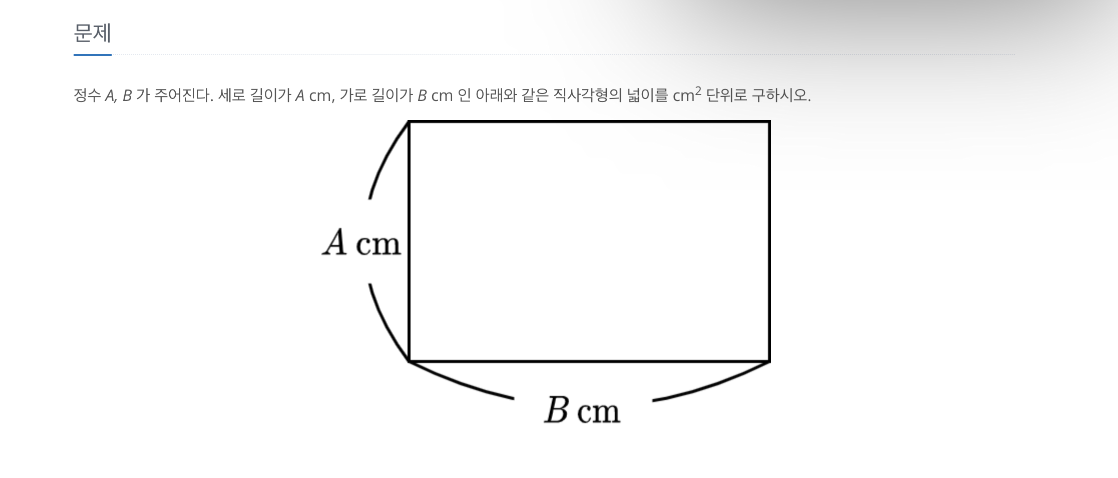정수 A, B 가 주어진다. 세로 길이가 A cm, 가로 길이가 B cm 인 아래와 같은 직사각형의 넓이를 cm2 단위로 구하시오.