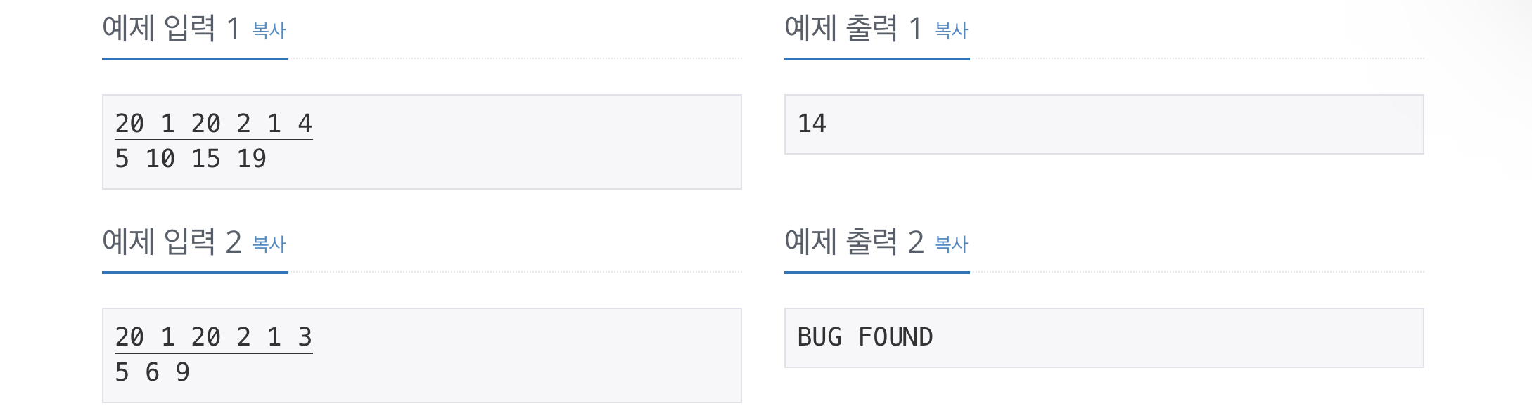 해당 과정을 queue가 빌 때 까지 반복하며, queue가 비었지만 도착하지 못했다면, “BUG FOUND”, 도착했다면 도착 변수 값을 출력해주면 됩니다.