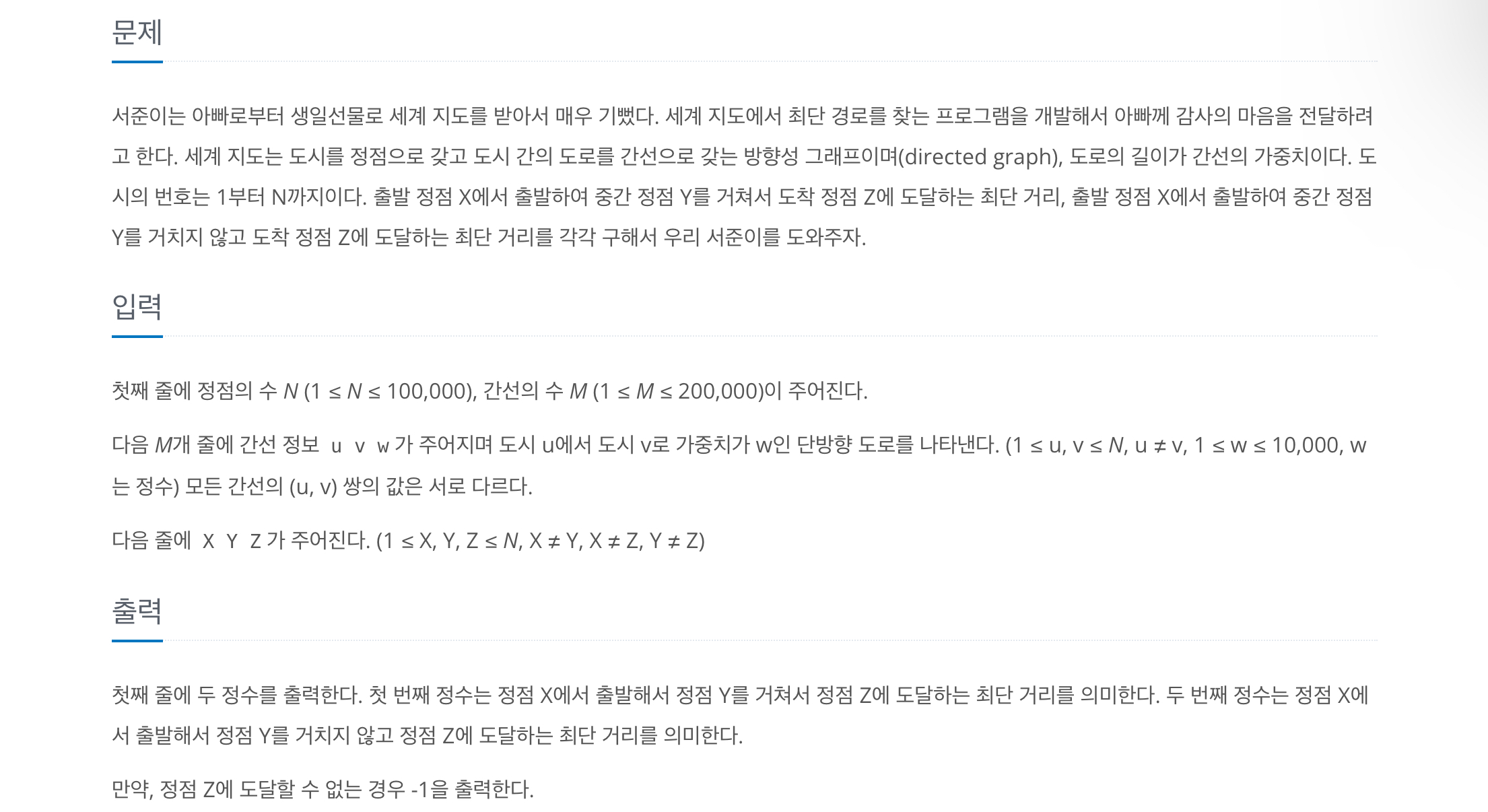 서준이는 아빠로부터 생일선물로 세계 지도를 받아서 매우 기뻤다. 세계 지도에서 최단 경로를 찾는 프로그램을 개발해서 아빠께 감사의 마음을 전달하려고 한다. 세계 지도는 도시를 정점으