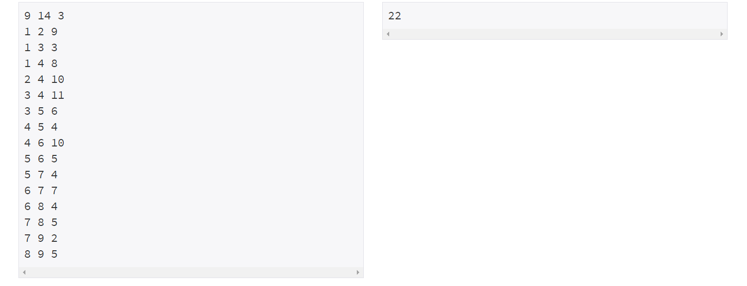 첫째 줄에는 도시의 개수 N(1 ≤ N ≤ 1,000)과 설치 가능한 케이블의 수 M(1 ≤ M ≤ 100,000)개, 발전소의 개수 K(1 ≤ K ≤ N)개가 주어진다. 둘째 줄에는 발전소가 설치된 도시의 번호가 주어진다. 셋째