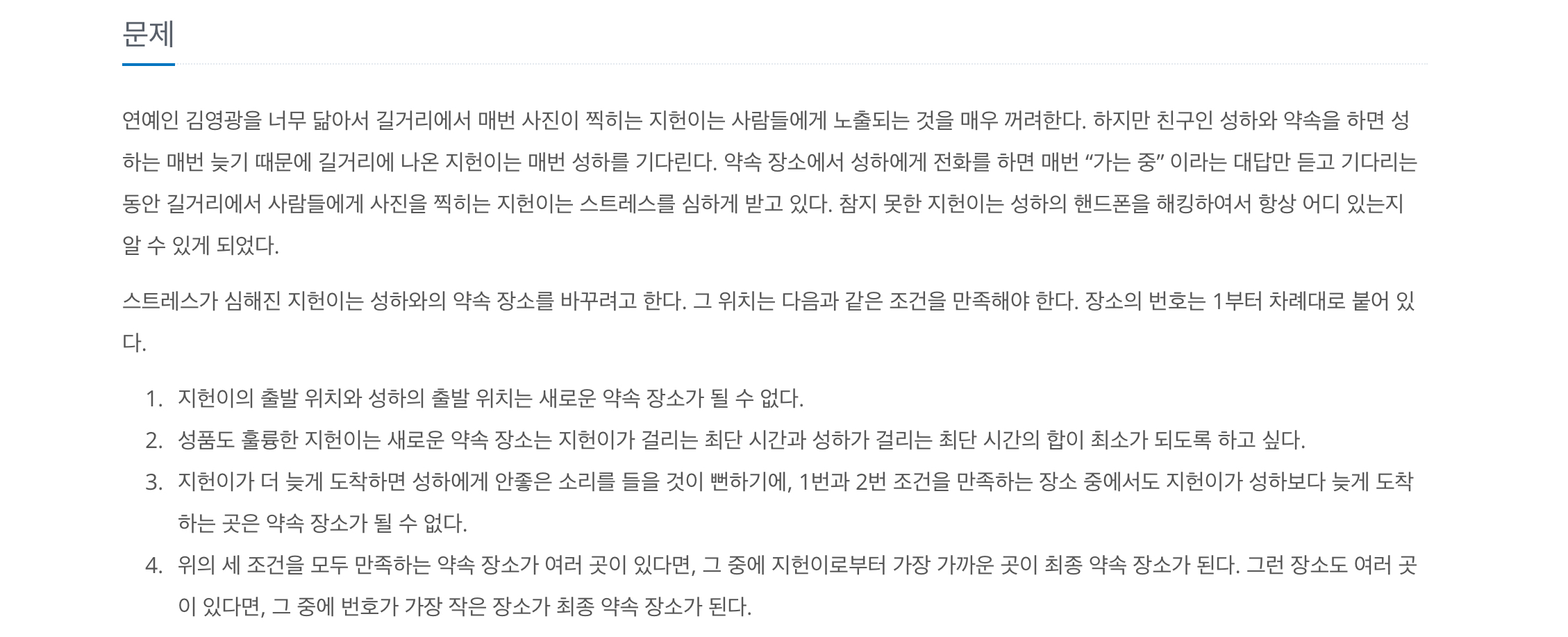 4. 위의 조건을 모두 만족하는 장소가 있다면, 지헌이한테 가장 가까운 곳이 선정됩니다.