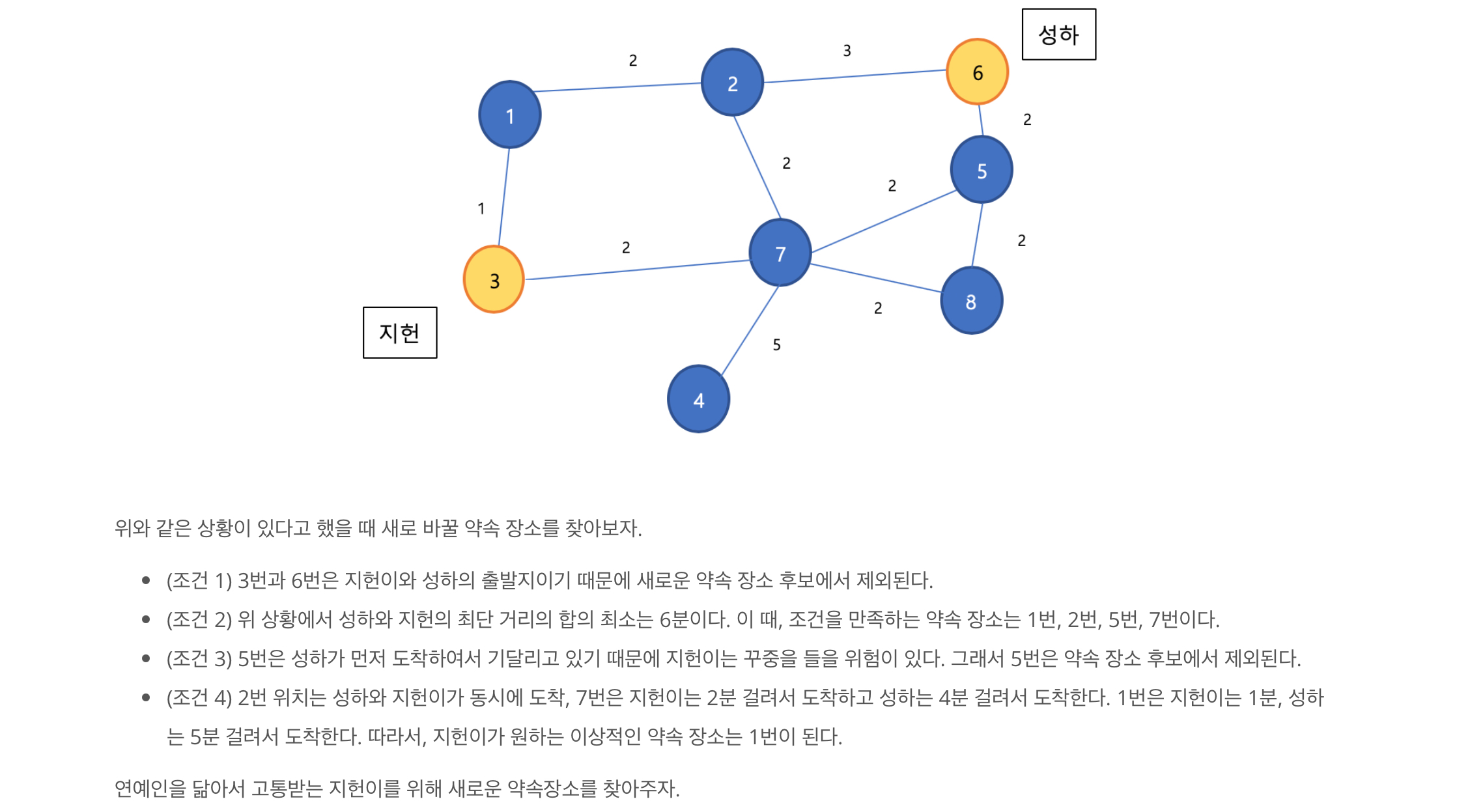 그렇다면, 지헌이가 다른 정점들까지 걸리는 비용과 성하가 다른 정점들까지 걸리는 비용을 따로 구한 뒤,