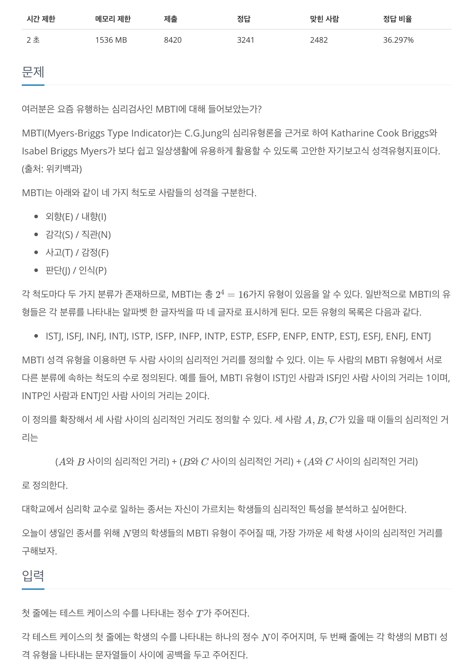 16개의 mbti를 중복이 가능하게 주어졌을 때, 3명의 심리적 거리를 구하는 문제입니다.
