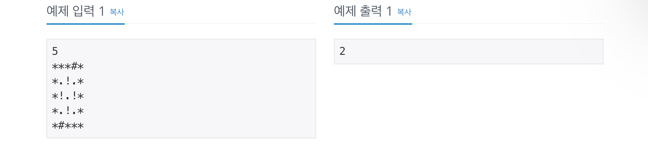 첫째 줄에 집의 크기 N (2 ≤ N ≤ 50)이 주어진다. 다음 N개의 줄에는 N개의 문자로 집에 대한 정보가 주어진다. ‘#’는 문이 설치된 곳으로 항상 두 곳이며, ‘.’은 아무 것도 없는 것으로 빛은