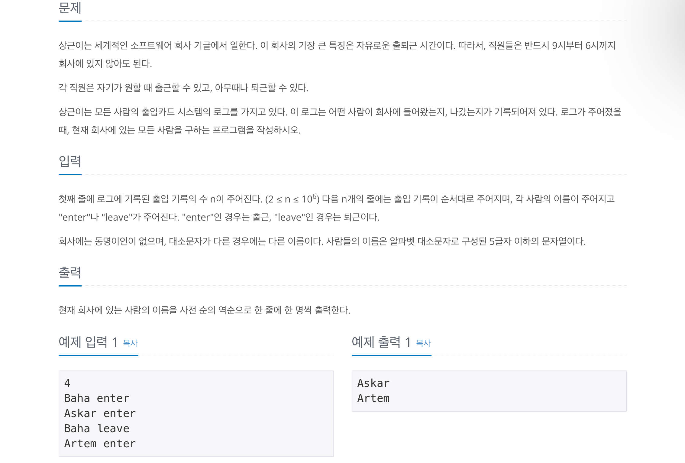 첫째 줄에 로그에 기록된 출입 기록의 수 n이 주어진다. (2 ≤ n ≤ 106) 다음 n개의 줄에는 출입 기록이 순서대로 주어지며, 각 사람의 이름이 주어지고 "enter"나 "leave"가 주어진다. "enter"인 경우는