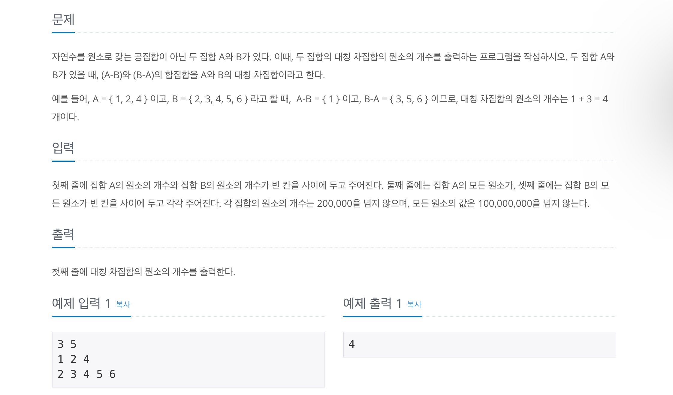 첫째 줄에 집합 A의 원소의 개수와 집합 B의 원소의 개수가 빈 칸을 사이에 두고 주어진다. 둘째 줄에는 집합 A의 모든 원소가, 셋째 줄에는 집합 B의 모든 원소가 빈 칸을 사이에 두고 각각 주어