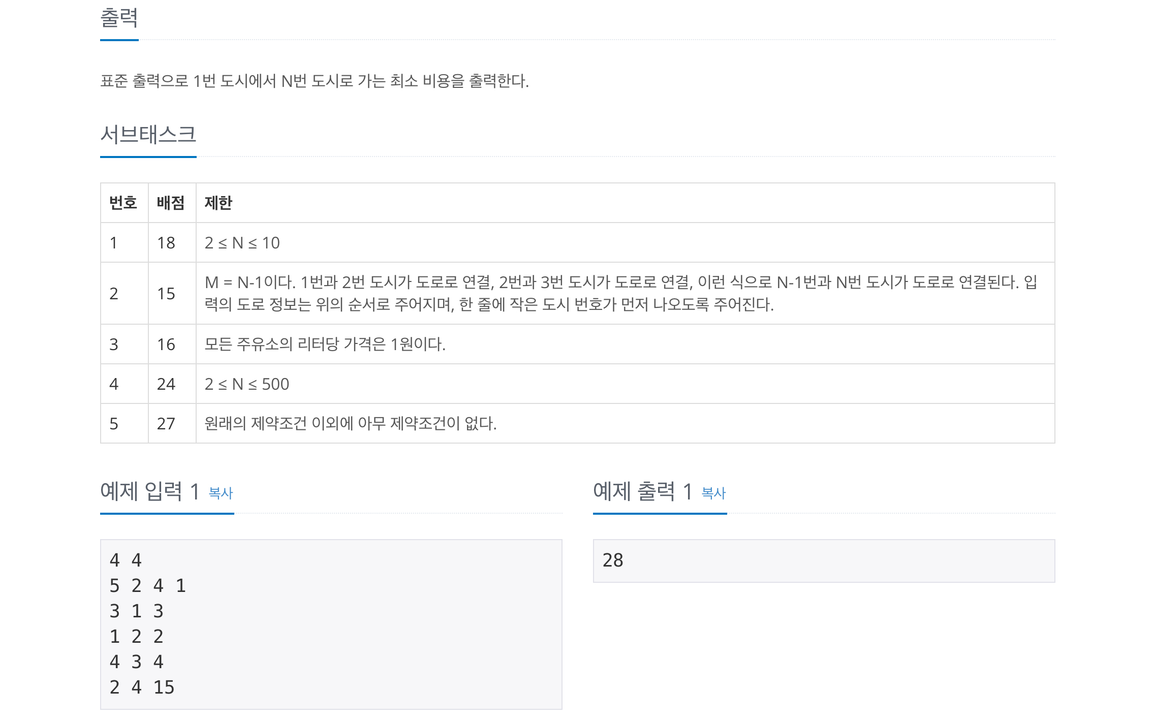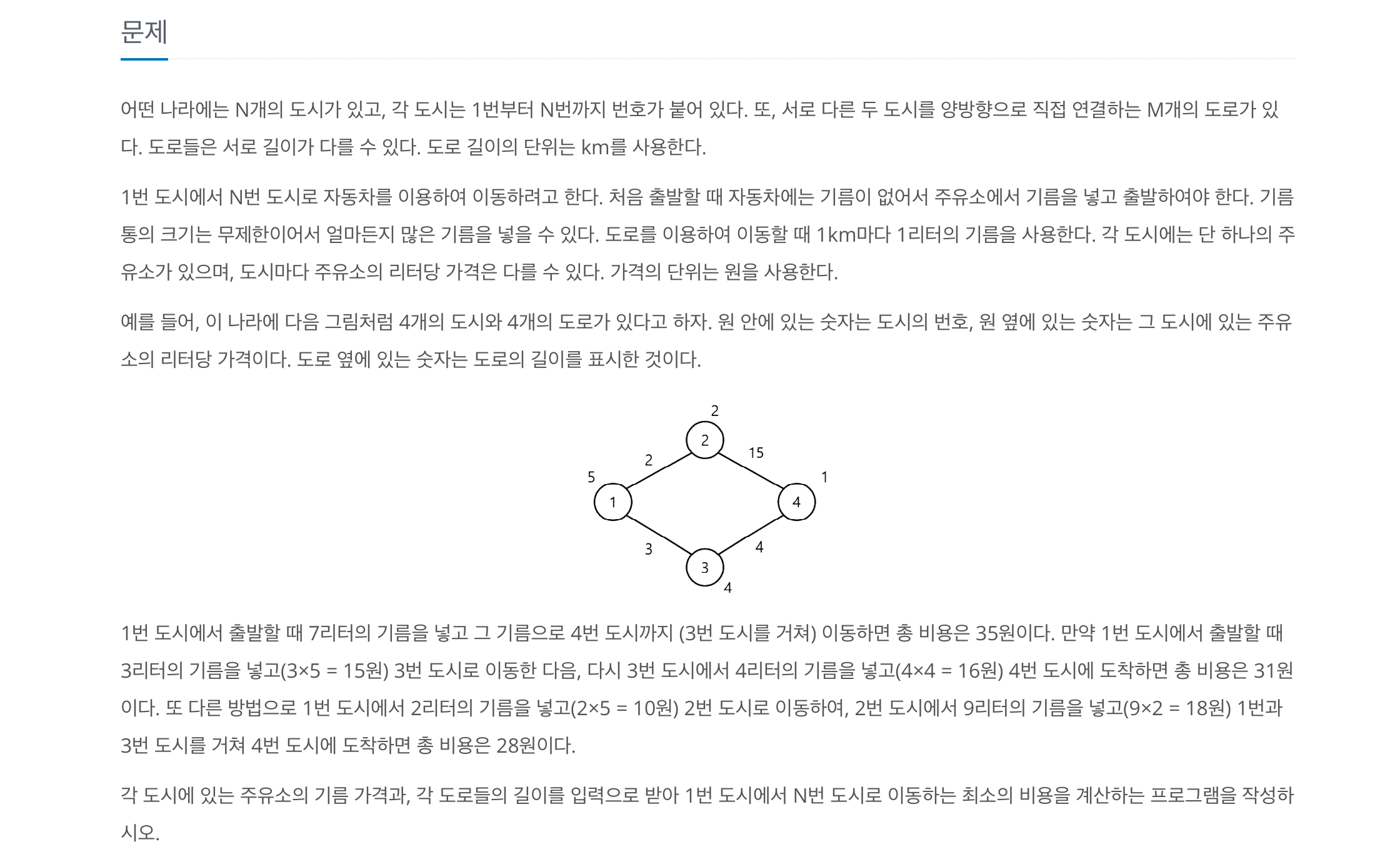 이 문제는 1번부터 N번점까지 이동할 때, 필요한 최소 비용을 구하는 문제입니다.