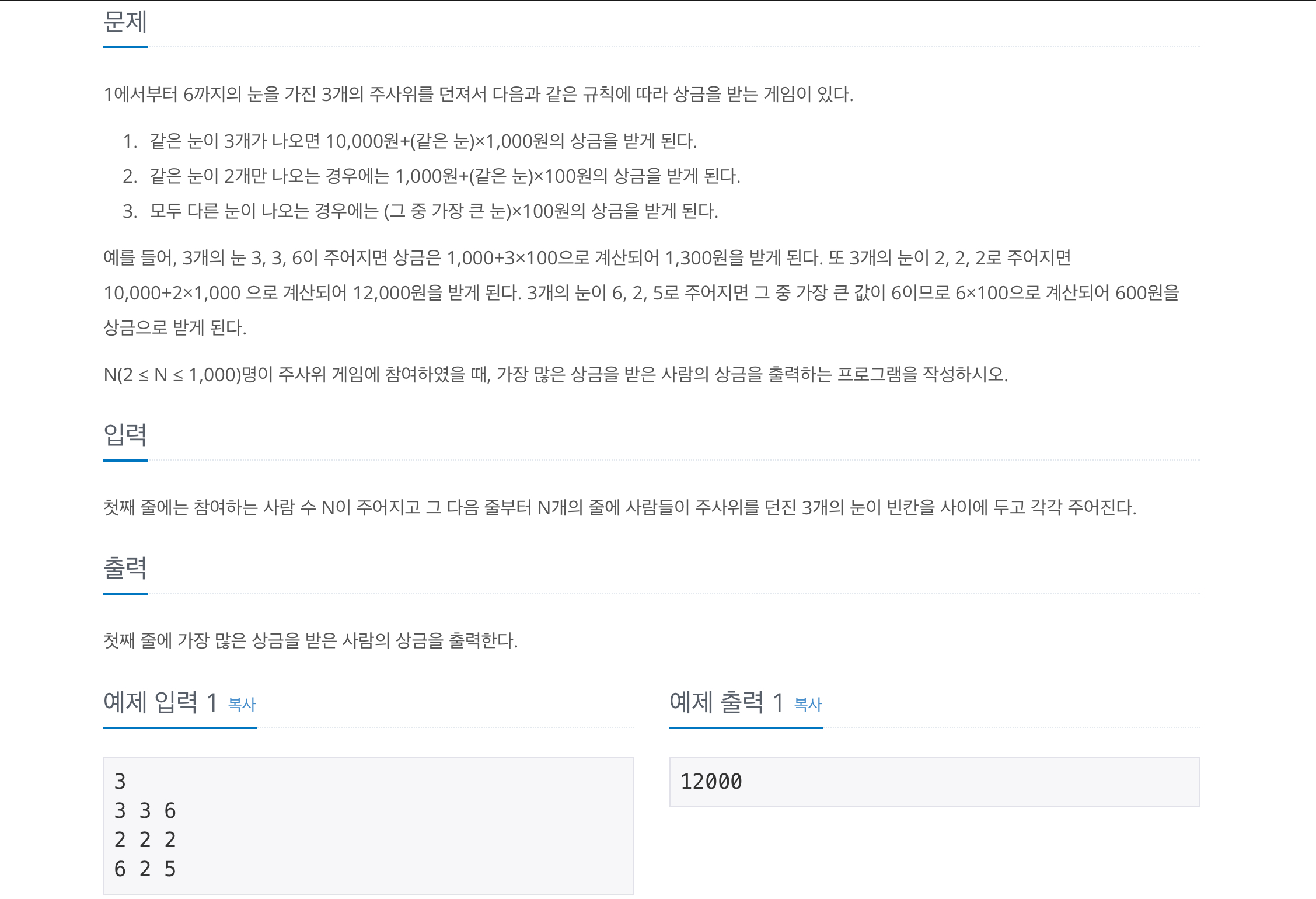 첫째 줄에는 참여하는 사람 수 N이 주어지고 그 다음 줄부터 N개의 줄에 사람들이 주사위를 던진 3개의 눈이 빈칸을 사이에 두고 각각 주어진다.