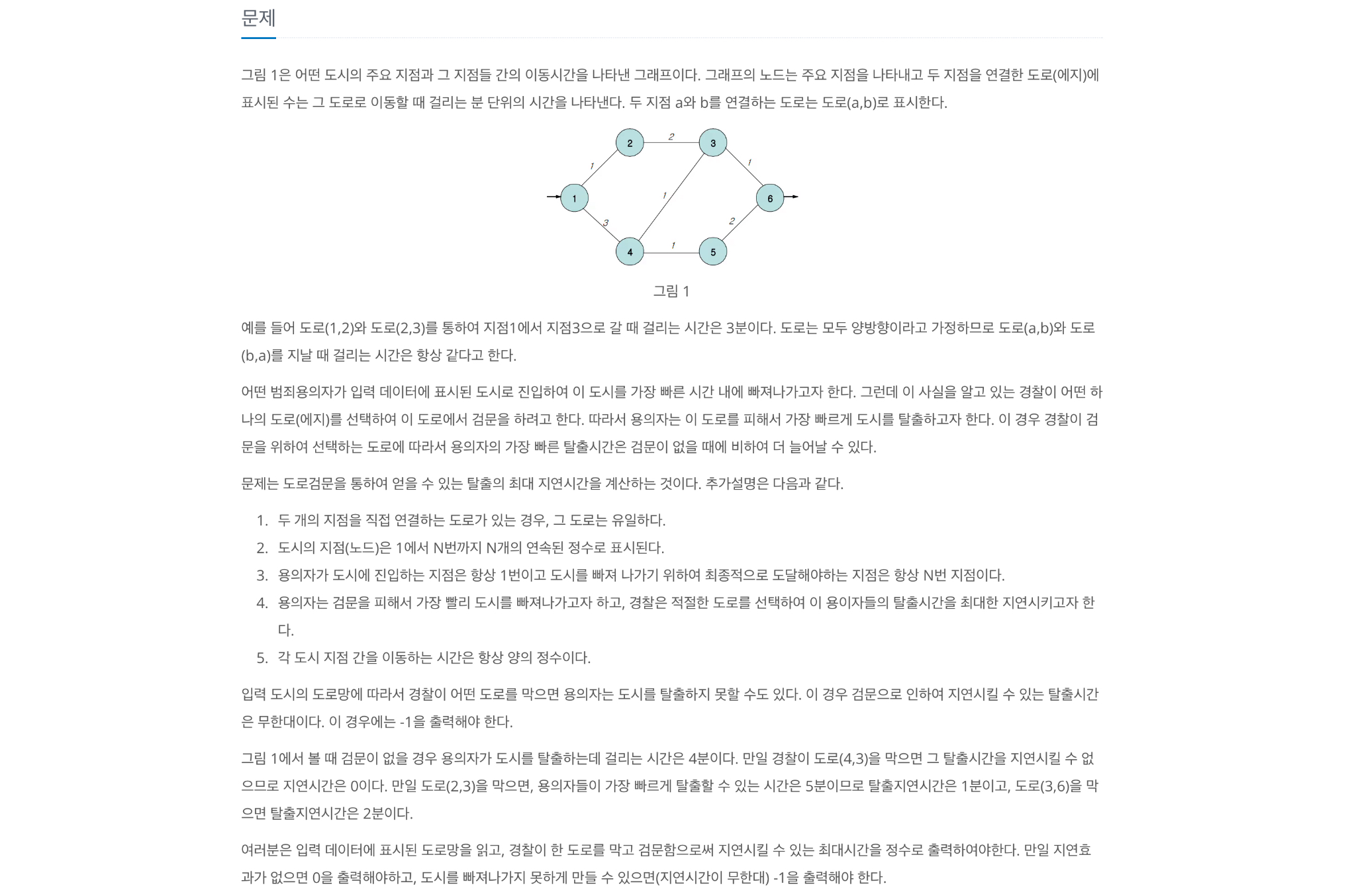 그림 1은 어떤 도시의 주요 지점과 그 지점들 간의 이동시간을 나타낸 그래프이다. 그래프의 노드는 주요 지점을 나타내고 두 지점을 연결한 도로(에지)에 표시된 수는 그 도로로 이동할 때 걸리