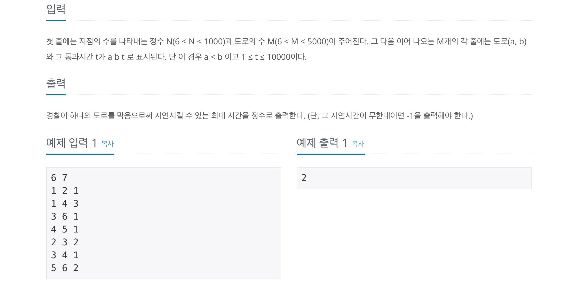 문제에서 주어진 그림으로 확인해 본다면, (1 -> 4), (4 -> 5), (5 -> 6), (3, -> 4)의 길을 제한한다고 해도,