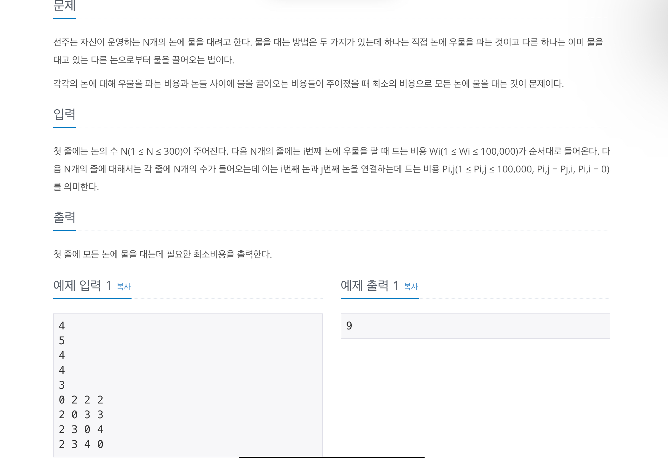 예를 들어, 존재하지 않는 0번이라는 우물에서 1 ~ N까지의 연결된 간선을 논에 우물을 파는 방법으로 바꾼다면, 의미는 같지만 더욱 쉽게 바뀌었습니다.