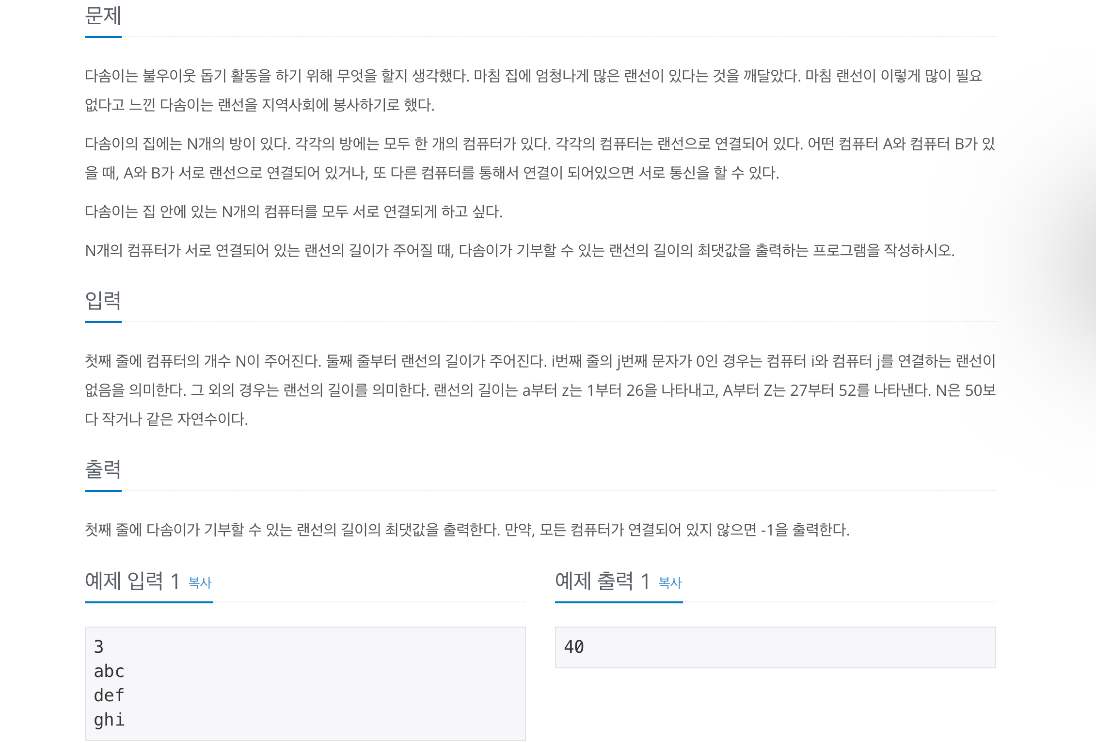 첫째 줄에 컴퓨터의 개수 N이 주어진다. 둘째 줄부터 랜선의 길이가 주어진다. i번째 줄의 j번째 문자가 0인 경우는 컴퓨터 i와 컴퓨터 j를 연결하는 랜선이 없음을 의미한다. 그 외의 경우는 랜선