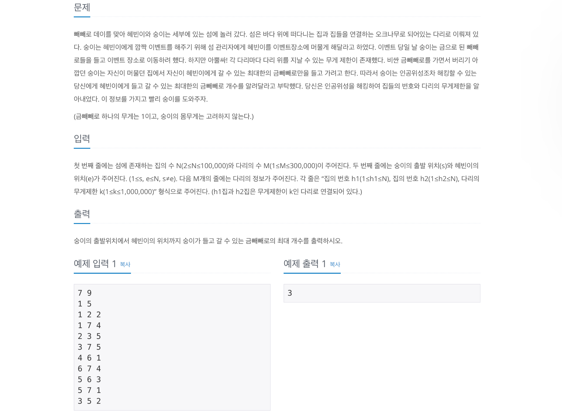 들고 갈 수 있는 금빼빼로는 다리를 이동할 때, 해당 다리의 비용만큼만 들고 갈 수 있습니다.
