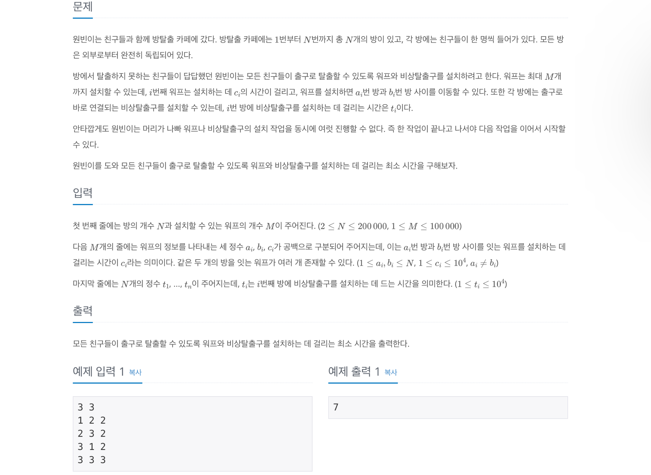 워프와 비상탈출구를 설치해 모든 친구들이 탈출하려고 할 때 걸리는 최소 시간을 구하는 문제입니다.