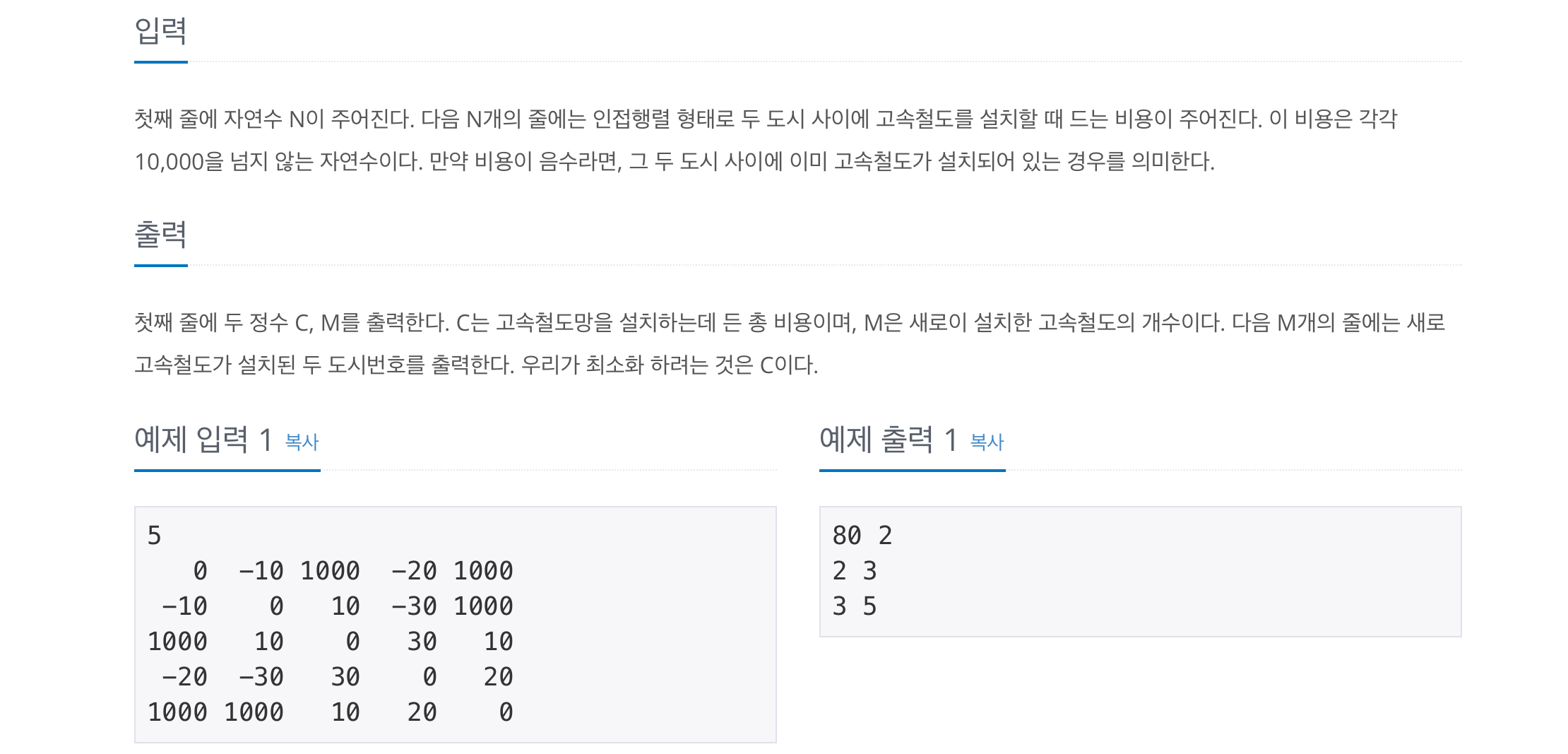 이때의 연결된 도로 비용의 최솟값과 어떤 도로들이 추가로 연결되었는지를 출력해주면 됩니다.