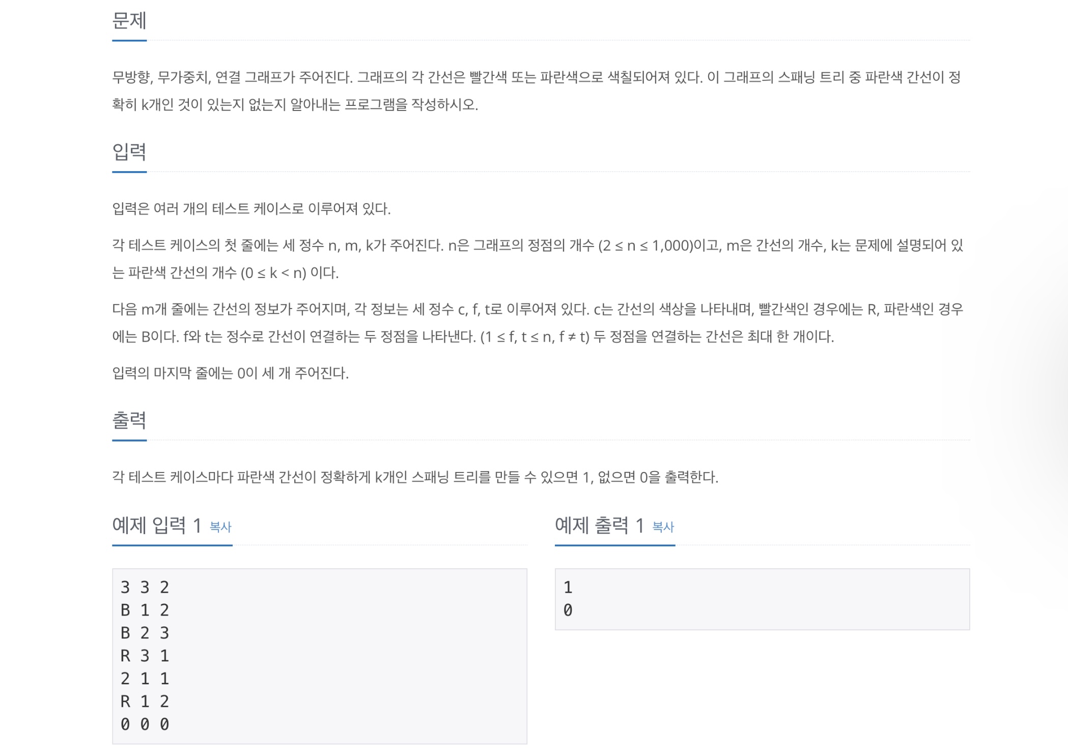 무방향, 무가중치, 연결 그래프가 주어진다. 그래프의 각 간선은 빨간색 또는 파란색으로 색칠되어져 있다. 이 그래프의 스패닝 트리 중 파란색 간선이 정확히 k개인 것이 있는지 없는지 알아내