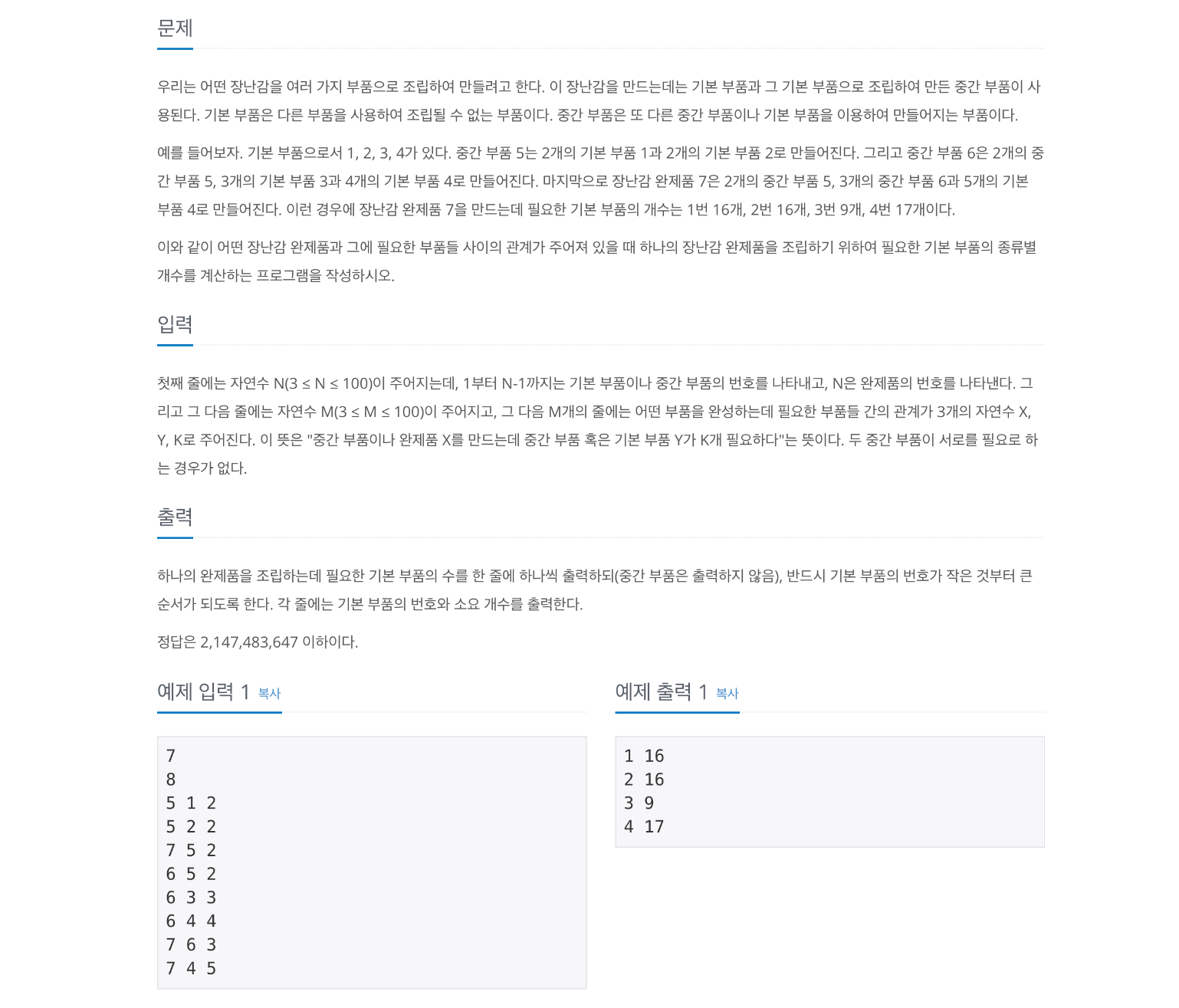 문제에서 주어진 예시를 확인해보겠습니다.(입력에서 1,2,3,4 -> 기본 부품 / 5, 6 -> 중간 부품 / 7 -> 완제품임을 알 수 있습니다.)