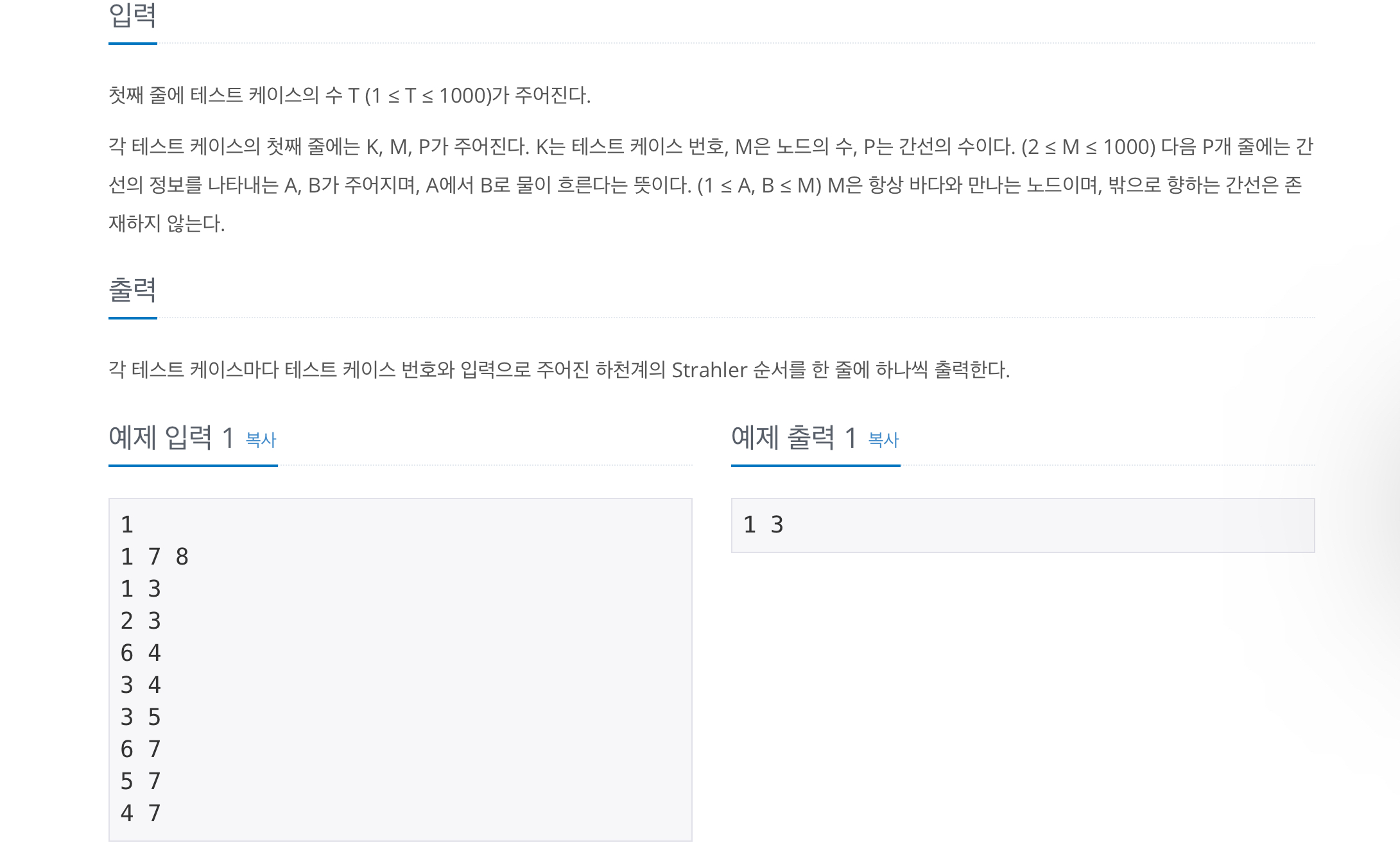 따라서, 강들의 단계를 찾은 뒤, 1번째 단계의 강부터 확인해 M번째 강까지 Strahler 순서를 갱신해 나가면 됩니다.