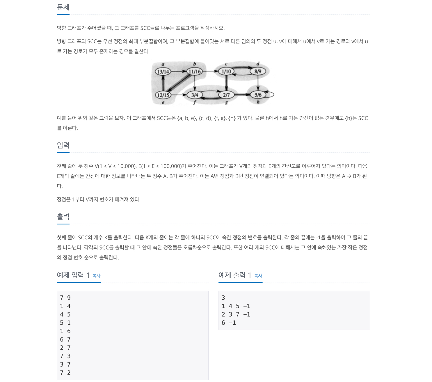 이를 통해서 SCC를 구했다면, 문제에서 주어진 정렬을 통해 정렬을 한 뒤, 구성 요소들을 출력해주면 됩니다.