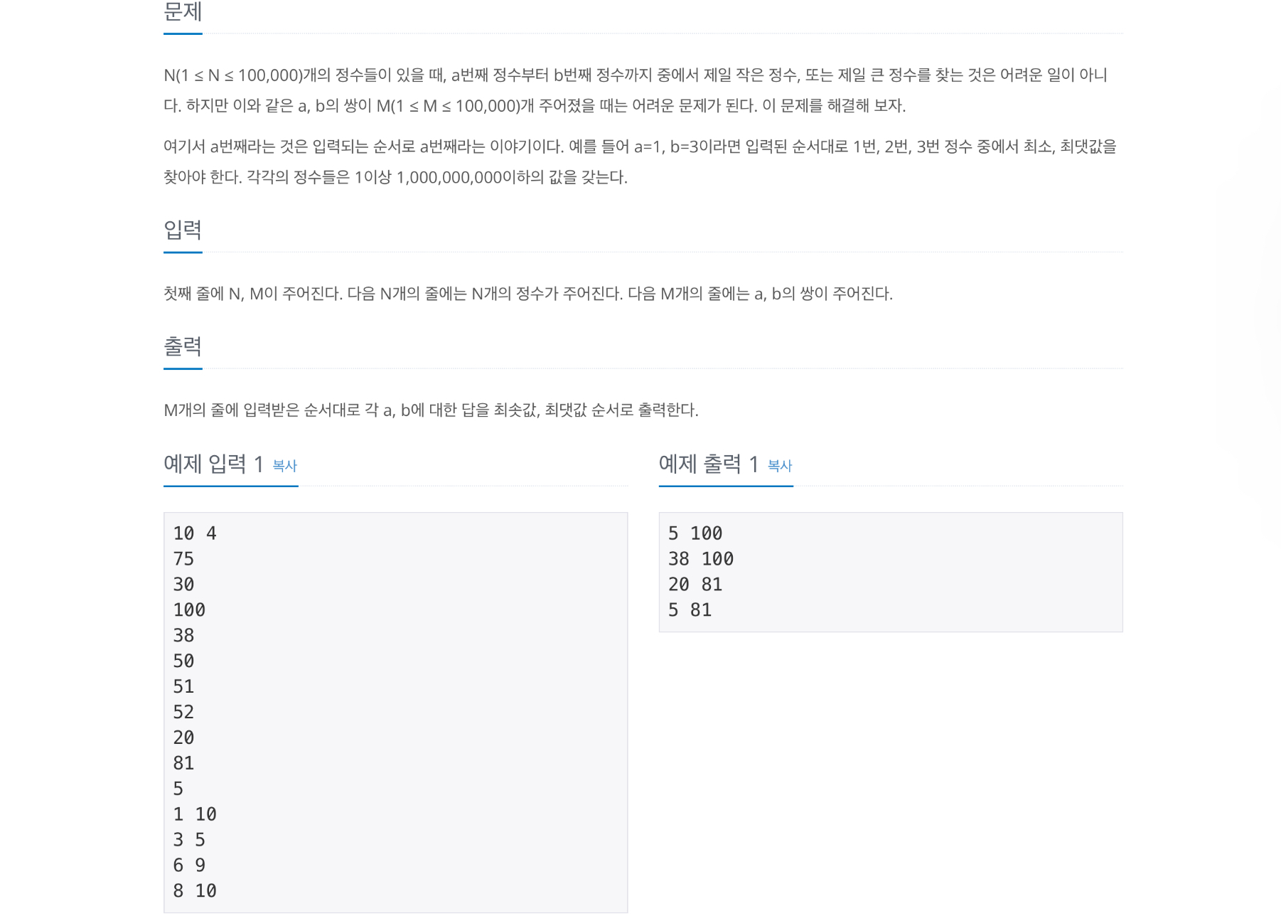 N(1 ≤ N ≤ 100,000)개의 정수들이 있을 때, a번째 정수부터 b번째 정수까지 중에서 제일 작은 정수, 또는 제일 큰 정수를 찾는 것은 어려운 일이 아니다. 하지만 이와 같은 a, b의 쌍이 M(1 ≤ M ≤ 100