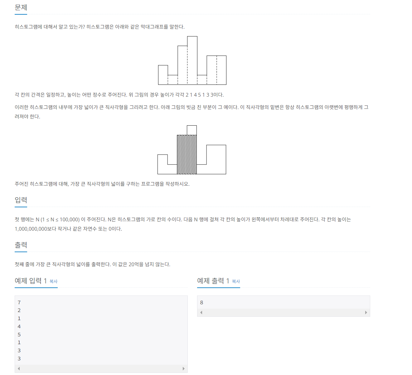 N개의 직사각형의 높이가 주어졌을 때, 히스토그램에서 가장 넓이가 큰 직사각형을 구하는 문제입니다.