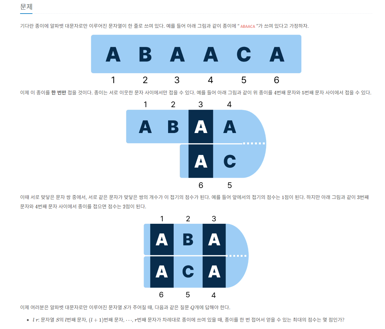 문자열이 하나 주어지고, 범위가 주어졌을 때, 주어진 범위를 잘 접어서 최대로 겹치는 문자 수를 구하려고 합니다.
