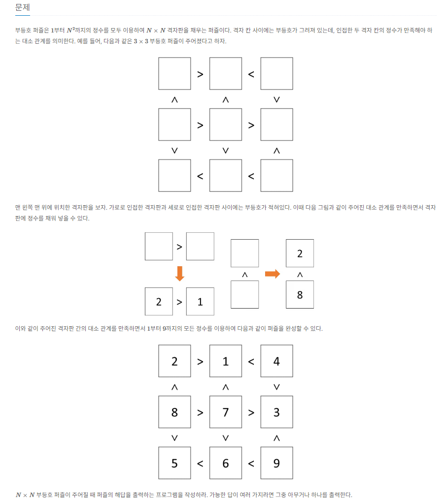 각 좌표들의 부등호가 주어질 때, 이를 통해서 올바른 퍼즐을 구하는 문제입니다.