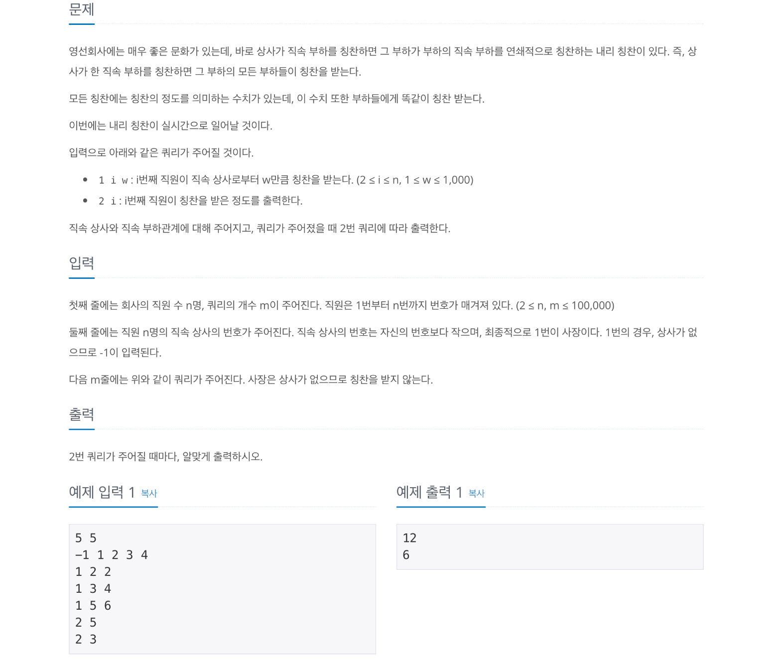 | 문제 링크입니다. https://www.acmicpc.net/problem/14268 |