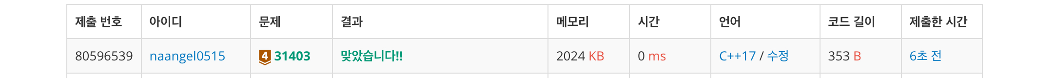 | 문제 링크입니다. https://www.acmicpc.net/problem/31403 |