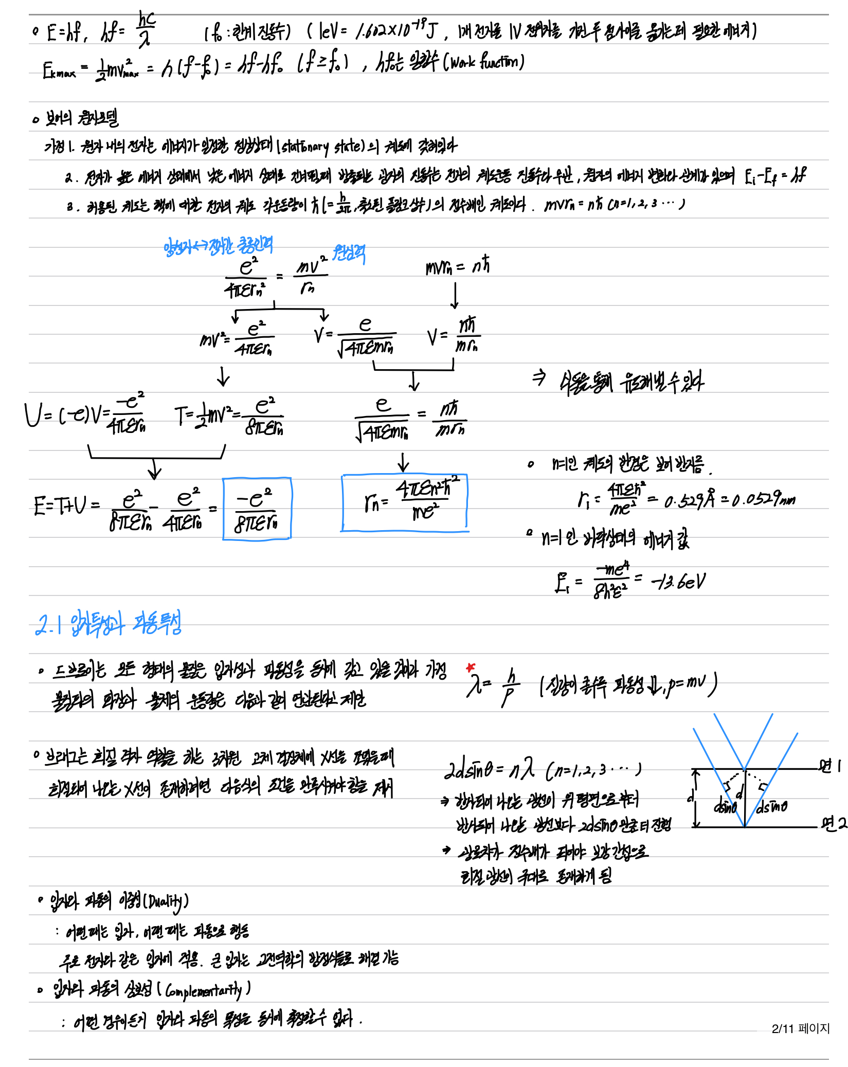 입자의 파동 특성과 보어의 원자 모델을 통한 식들의 유도가 중요합니다.