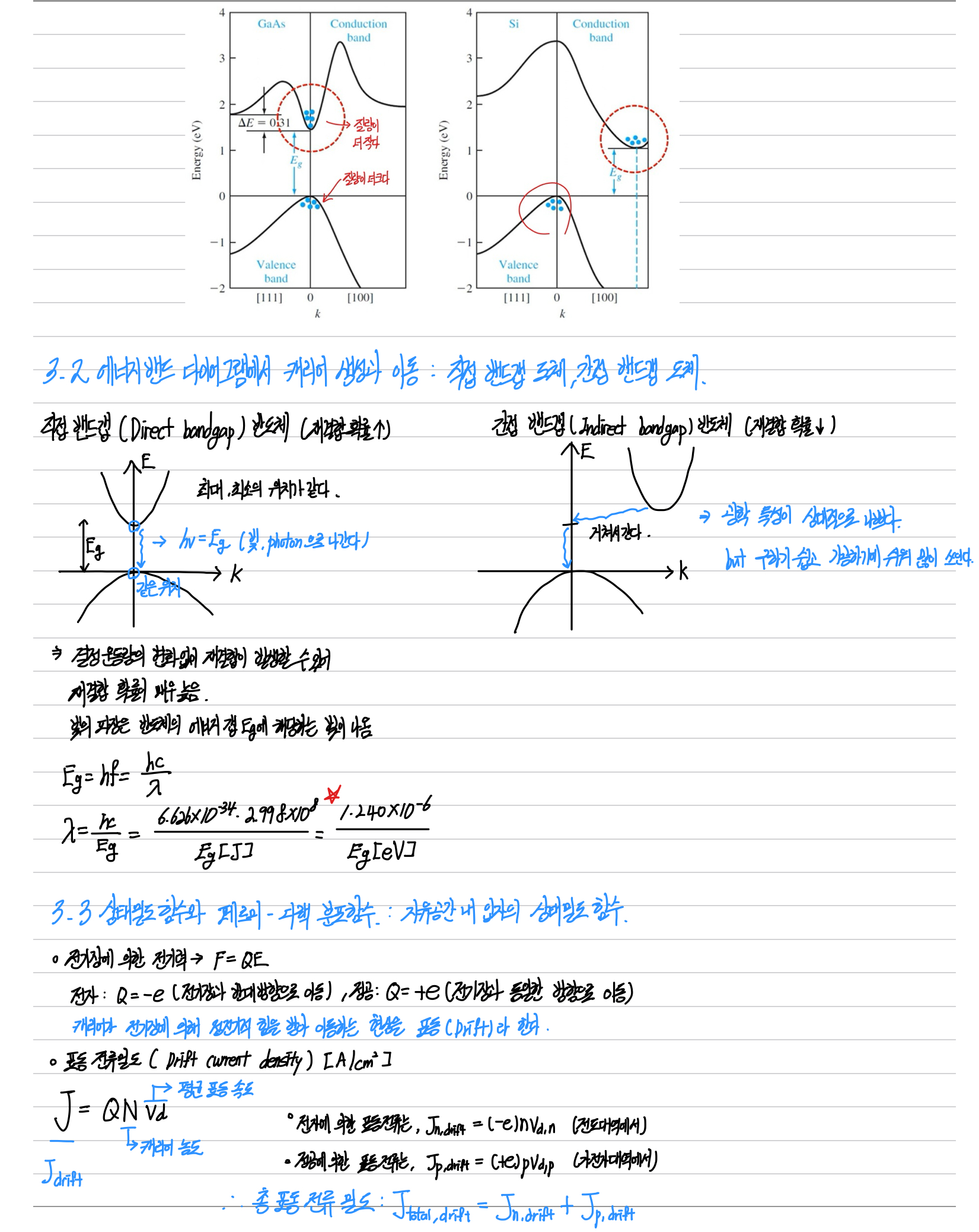 - 직접 밴드갭: 전도대의 최소 에너지점과 가전자대의 최대 에너지점이 같은 k-값에 위치 → 전자-정공 재결합 확률 높음, 광학 소자에 유리