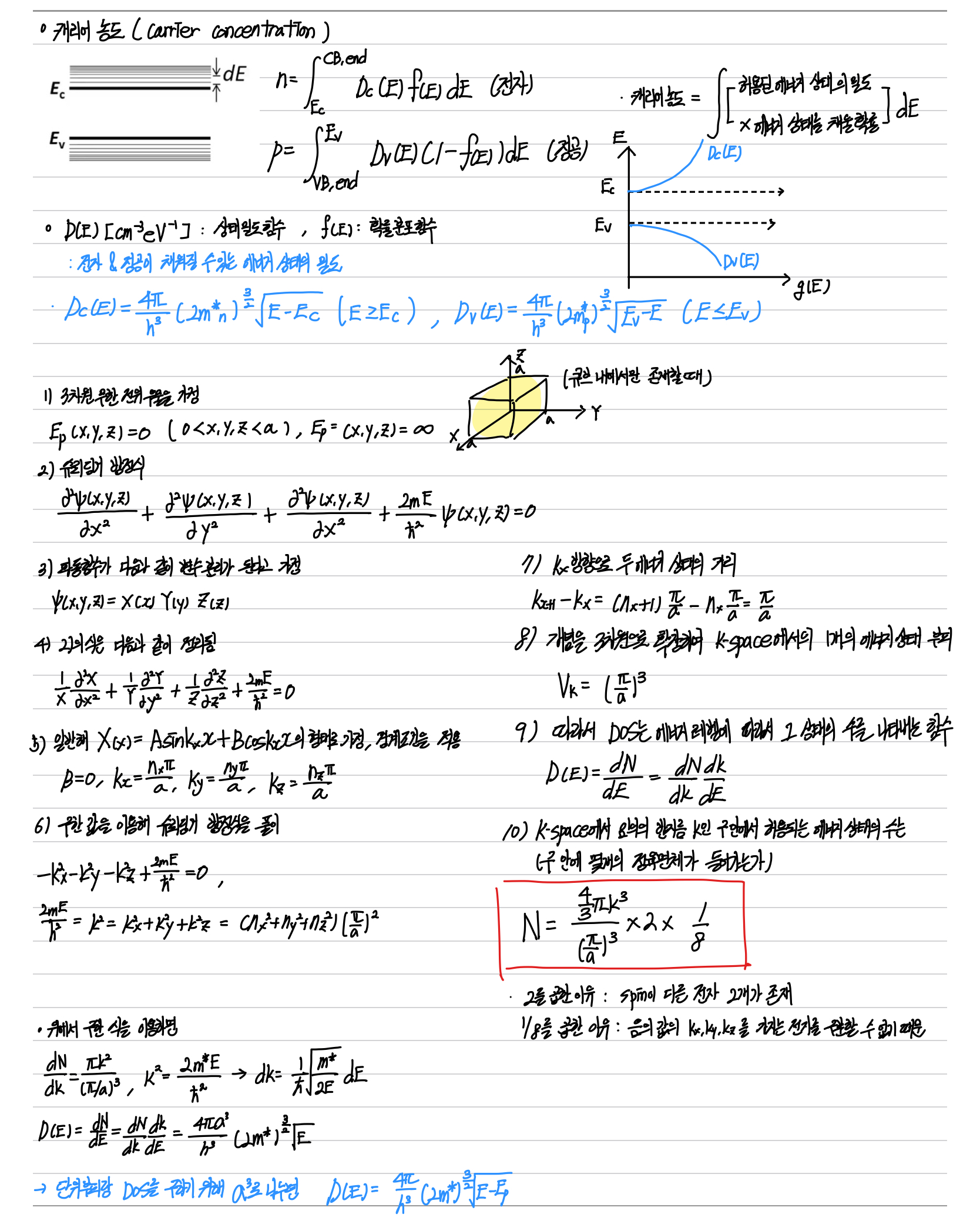 이제 캐리어 농도를 구하는 내용이 나옵니다. 캐리어 농도를 구하는 공식이 어떻게 증명되는지를 이해해주시면 됩니다.
