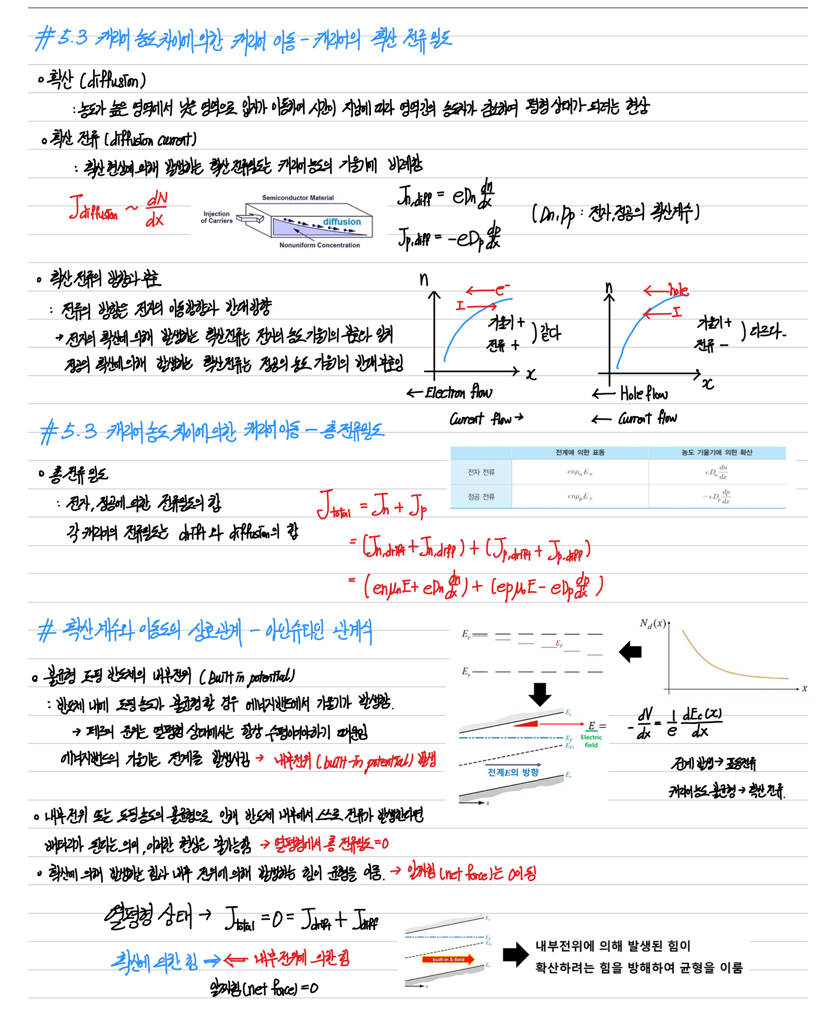 확산 전류가 어떤 의미인지, 캐리어 농도의 기울기에 어떤 관련이 있는지를 확인해주시야 합니다.