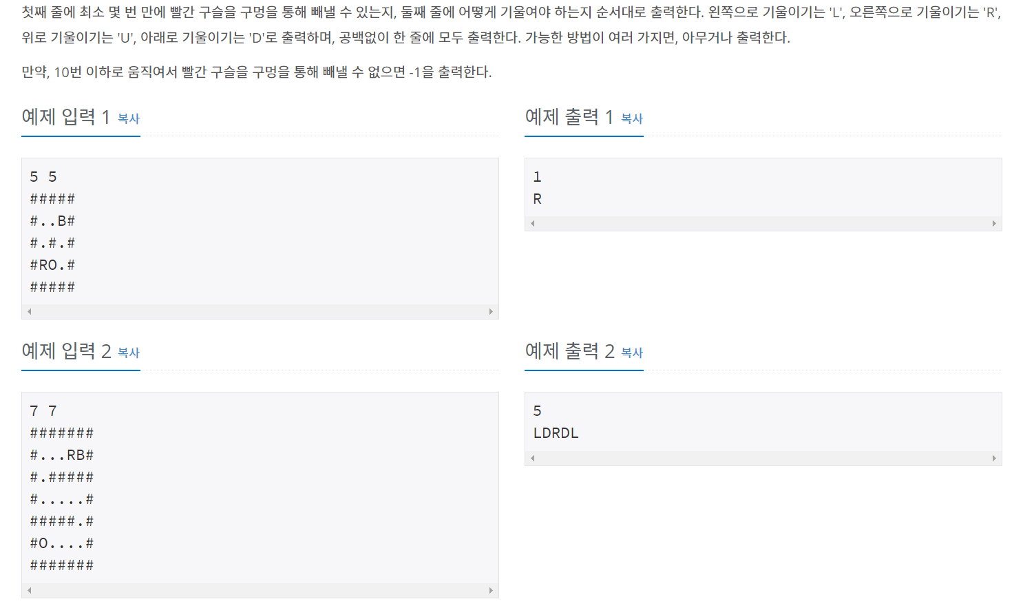 빨간 구슬의 위치가 구멍이라면, 이동 횟수를 저장하고 BFS를 마무리했습니다. 혹은 이동 횟수가 10회 초과라면 BFS를 끝냈습니다. 4방향에 따라서 D,R,U,L을 각각 넣었습니다.